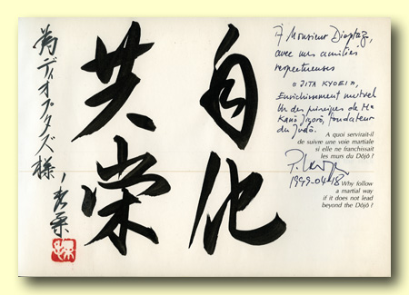 Calligraphie réalisée et offerte, le 1octobre 2008, par maître Masamichi Noro à maître Michel-Laurent Dioptaz. (voir site de M.L.Dioptaz:www.dioptaz.com)