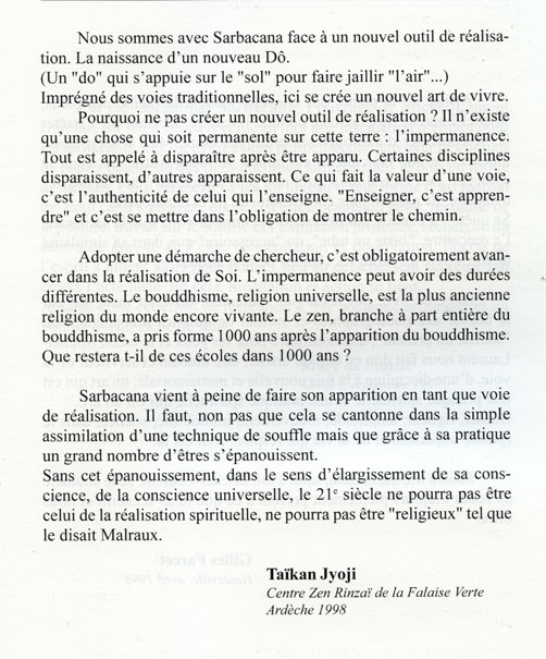 Calligraphie réalisée le 18 avril 1999 par Sensei Pascal Krieger offerte à M.L. Dioptaz en écho au Sarbacana en accompagnement de son ouvrage "Jodô la Voie du bâton".